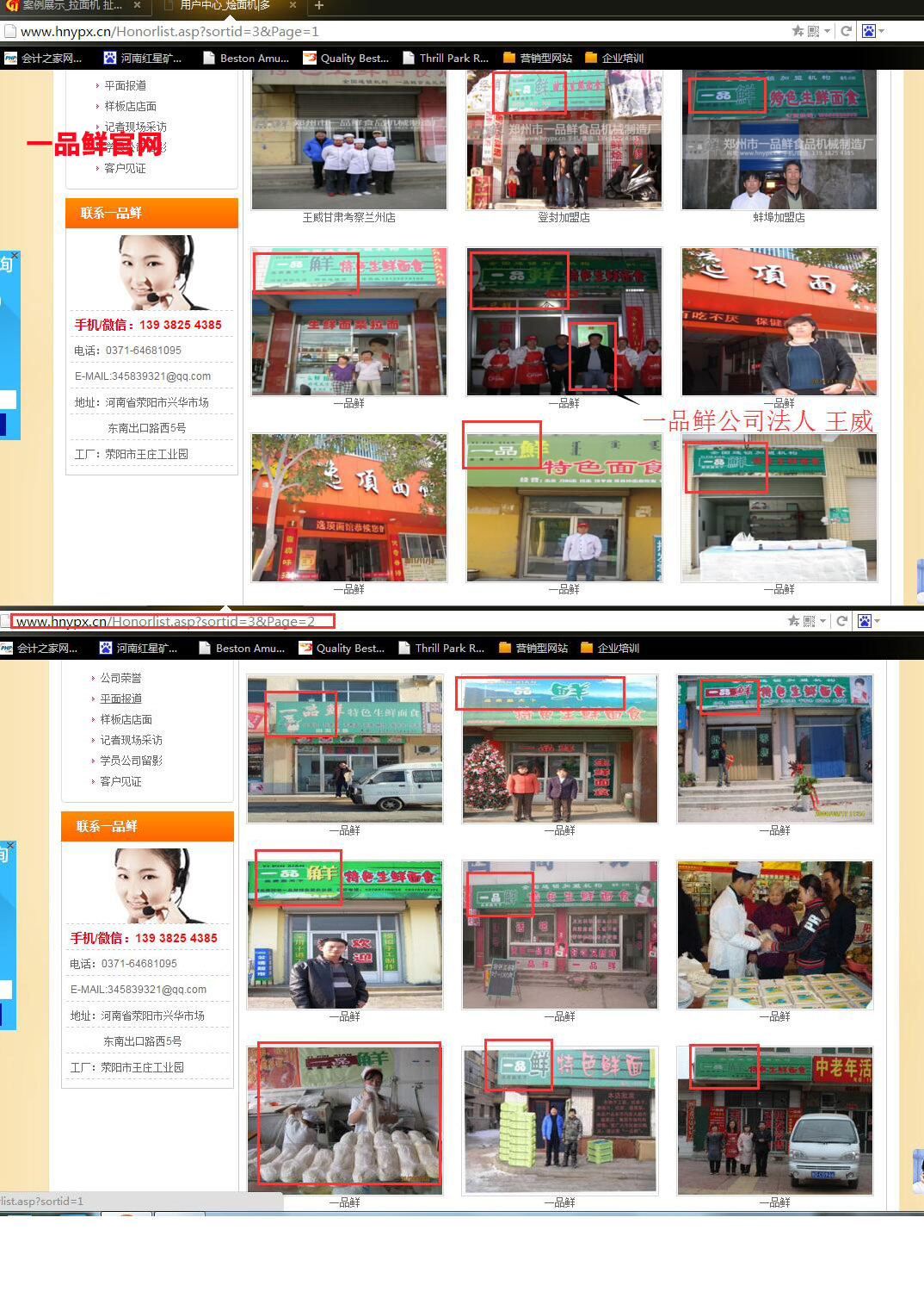 客戶案例中盜用一品鮮的客戶案例圖片,將店鋪門頭上的“一品鮮”字樣用圖片處理軟件擦掉,以起到蒙騙客戶的作用?尚Φ氖潜I用圖片中,一品鮮公司法人代表王總的照片也赫然在列。試問這樣的廠家您敢選擇嗎?